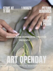 L’evento rappresenta un’occasione preziosa per avvicinarsi al mondo dell’arte come esperienza autentica e condivisa. L’Open Day del 1° marzo con il maestro Br1 ha già acceso un entusiasmo travolgente, così si è deciso di raddoppiare la magia. Oltre alla pittura potrete mettere le mani anche nell’argilla e assaporare un po’ di ceramica con la ceramista Marialuisa Aiello l’argilla prenderà forma attraverso il gesto restituendo il valore profondo del contatto con la materia.
