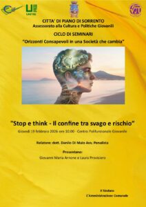 Un invito a fermarsi, riflettere e diventare consapevoli. È questo il messaggio al centro dell’incontro “Stop e think – Il confine tra svago e rischio”, in programma giovedì 19 febbraio, alle ore 10.00, presso il Centro Polifunzionale Giovanile di Piano di Sorrento, nell’ambito del ciclo di seminari “Orizzonti Consapevoli in una Società che cambia”, promosso dalla Città di Piano di Sorrento – Assessorato alla Cultura e Politiche Giovanili.