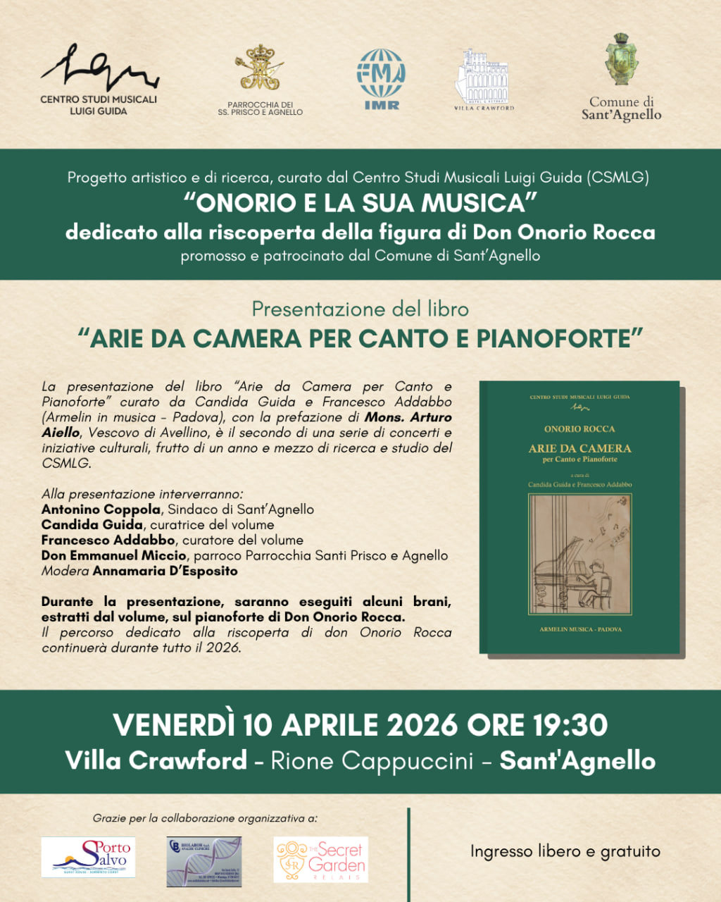 Venerdì 10 aprile 2026 alle ore 19:30 a Villa Crawford, nel luogo che ha ospitato la creatività e l’opera di divulgazione di Don Onorio Rocca, verrà presentato il libro “Arie da camera per Canto e Pianoforte” curato da Candida Guida, Presidente del CSMLG, e da Francesco Addabbo, con la prefazione di Mons. Arturo Aiello, Vescovo di Avellino, profondamente legato alla figura di Don Onorio.