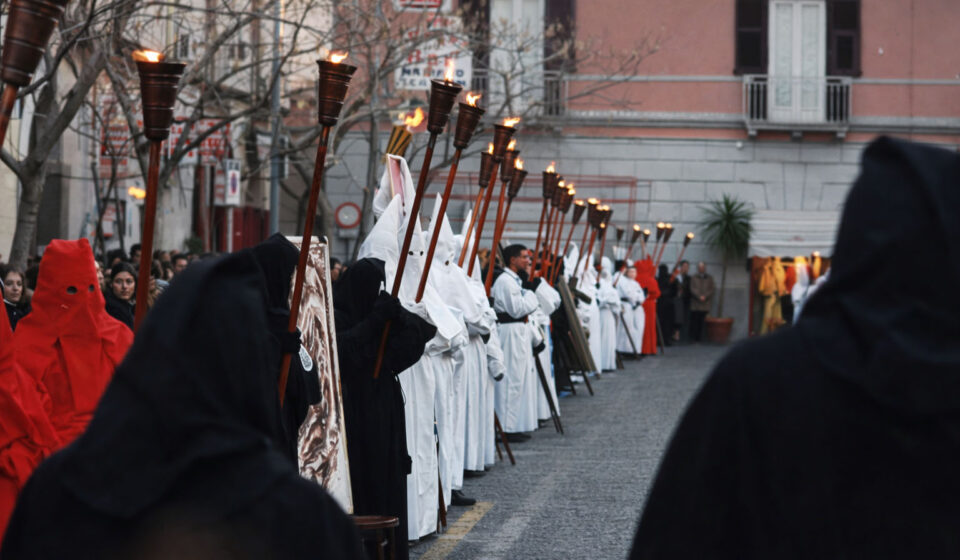 Nel triduo pasquale andavamo la mattina in San Michele per le Lamentazioni; noi cantori e i preti dall’altare, Lina e Lena con le ragazze nei primi banchi e ricordo pure che a un certo punto, dovevamo simulare il terremoto, facendo rumore con le sedie. Un anno a casa della nonna in via Bagnulo l’impasto in cucina e poi i ruoti da portare su, per cuocere le pastiere nel forno di campagna di Concettina. Una mattina di inizio quaresima c’era la Quaraesema pesula pesula che pendeva davanti alla finestra della cucina. Ce l’avevano messa le De Maria, che dal terrazzo sopra ridevano divertite. Le fresie profumavano dai muri in Via Bagnulo. Pioveva talmente che dovettero portare l’Addolorata nel portone di Palazzo Pane, ancora a Bagnulo, era di notte. Il tortano e il mazzetto di fresie per aver fatto l’apostolo alla lavanda dei piedi nella funzione in Coena Domini. Nella Pasticceria Cadolini per ritirare il raffaiuolo coi confettini, premio per aver cantato il Calvario. Le prove del Miserere di Verdi con il M° Attardi al posto di quello vecchio tradizionale. La vecchietta con la frasca di ulivo pieno di provoloncini e nastri colorati. Zia Francesca preparava le palme di confetti per tutti i nipoti e la casa profumava di zucchero bruciato. Le foto ricordo con le palme fuori San Michele, le scattava Foto Pino. Le fresie sui muri in Via Carlo Amalfi. Il suono dei tamburi nell’aria, stanno facendo le prove, si accappona la pelle. Corriamo verso l’incrocio con Via Stazione dove passa la Nera. A Madonna di Rosella s’incontrano le due Addolorate, quella di Piano e quella di Meta. L’aria profuma di pastiere e casatielli. I tamburi, il coro e la sirena dell’ambulanza che deve passare. Quello della troccola è un rumore fastidioso. In salumeria Tommaso vende il grano per le pastiere. Il vento porta il battere dei tamburi, sono le due di notte. L’Ecce Homo di Trinità. La processione si è ritirata, il tempo è minaccioso, per rivederla dovremo aspettare un anno. In questa Pasqua del Covid il Priore Michele esce da solo con la veste nera e la piccola Addolorata tra le braccia; fa il giro che avrebbe fatto la processione. Don Alberto ci fa provare l’Inno e il Calvario. Si sente Il Figliol mio della processione di Mortora che scende da Santa Teresa. I soldati romani e le pie donne la sera del Venerdì Santo. Nella processione di Antonio Irolla la Madonna è Marilina Iacono, porta un fascio di gigli. Partecipo alla Via Crucis Arte, è una festa di colori; accanto a me Michela Ruberto e Annalisa Cinque coi loro cavalletti. Certe famiglie preparano il grano per il Sepolcro. Il fioraio va e viene in San Michele e porta fiori e grano. Le palme di Rino Elite esposte in vetrina, come sono belle! Dietro l’Addolorata di notte la nonna, Carolina, Giuseppina, zia Francesca e Floretta. Non possono aprire lo stendardo, c’è troppo vento. Passa Giosuè Perrella è il Priore della Nera, o è Gianfranco Savarese? Accanto a loro il Com. Pietrantonio Iaccarino. Chi è Gesù quest’anno, Mario, Massimo, Danilo o Alessandro? Franco Cuccaro dove sei? Eri il buon ladrone. Cristina Valcaccia nel mentre passa la processione, spiega a un’amica come fa la pastiera. Che bella l’Addolorata di Trinità. Peppe Locria è Ponzio Pilato sulla biga. Virginia Aversa è la Veronica. Stupendo il Crocifisso di Trinità che svelano in Piazza. La Via Crucis cantata di San Leonardo da Porto Maurizio. Con Teresa Aversa sul motorino, in giro per vedere le processioni della notte. Annamaria Gargiulo canta lo Stabat Mater. Aspettiamo che finisca di piovere per uscire in processione, tutto è pronto ma il tempo non ne vuol sapere. Pioverà a Pasquetta? I miei amici vogliono andare lo stesso. La predica del Purgatorio. Il casatiello con il naspro e i confettini colorati. Quest’anno la processione della notte parte dalla Marina. Fittiamo le luci da mettere fuori al balcone per quando passano le processioni, sono dei globi bianchi. Don Antonino non vuole che andiamo a cantare il vecchio Miserere perché ci inguaia la voce; se è quello di Verdi, possiamo. Si sentono i tamburi quasi sotto casa, dobbiamo scendere e mettiamo il cappotto sopra al pigiama, a Bagnulo passa pure la processione di Meta. Cesti pieni di rami d’ulivo. Passa il gallo che cantò tre volte, ci ricorda il tradimento di Pietro. L’Inno alla Croce dei Luigini. I panni viola coprono le statue dei santi. Com’è lunga la lettura del Passo, bisogna seguirla attentamente. Il fazzoletto dell’Addolorata è fatto di prezioso merletto, è un oggetto votivo. Il Priore dell’Annunziata è Costantino Cuccaro o il figlio Giuseppe. Michele? Lui è Gesù. Se il Venerdì Santo non esce il Cristo Morto, è di cattivo augurio. Antonietta Miele mi regala un rametto d’ulivo con un provoloncino che sarà il richiamo per un topo. Albeggia, le processioni rientrano nelle rispettive chiese. L’Altare della Reposizione di Santa Teresa è il più visitato dalle processioni. In questa prima processione dopo il Covid gli uomini del Miserere cantano pure al Calvario, i bambini non ci sono ed è commozione generale. Quest’anno Antonio Irolla fa Giuda Iscariota. Carmen Di Somma vuole vedere le processioni negli angoli più bui, evita in modo maniacale le luci. Nell’aria si sente il profumo delle pastiere, che meraviglia! Passa la processione dei Giuseppini, quanto è bello l’Inno di don Angelo. L’Addolorata di Santa Teresa sembra una scultura del Bernini. Don Vincenzo Simeoli porta la Croce sulla spalla, è scalzo, per penitenza e sembra Gesù Cristo! Com’è bella la vetrina di Ferdinando, c’è l’Addolorata, ci sono le palme di confetti tra anemoni, fresie e violacciocche e pure gli iris. Per il Miserere di Selecchy ci vorrebbero i cento violini di Chieti. In una cesta le palme intrecciate. Dobbiamo comperare le uova di cioccolato per i bambini. La Croce in piperno di Via Bagnulo. La corona di spine. Gli agnellini, le caprette, i pulcini e il gallo, poi la c