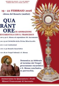 Positano. Dal 19 al 22 febbraio la comunità parrocchiale si prepara a vivere uno dei momenti più intensi dell’anno liturgico: le Quarantore di Adorazione Eucaristica con San Francesco, in programma presso la Chiesa del Rosario (Mulini).