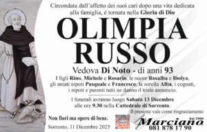 Sorrento porge l’estremo saluto alla 93enne Olimpia Russo, vedova Di Noto. A darne il triste annuncio i figli Rino, Michele e Rosario, le nuore Rosalba e Ibolya, gli amati nipoti Pasquale e Francesco, la sorella Alba, i cognati, i nipoti ed i parenti tutti che ora affidano la sua anima a Dio affinché la custodisca tra le sue amorevoli braccia e le doni il riposo eterno.
