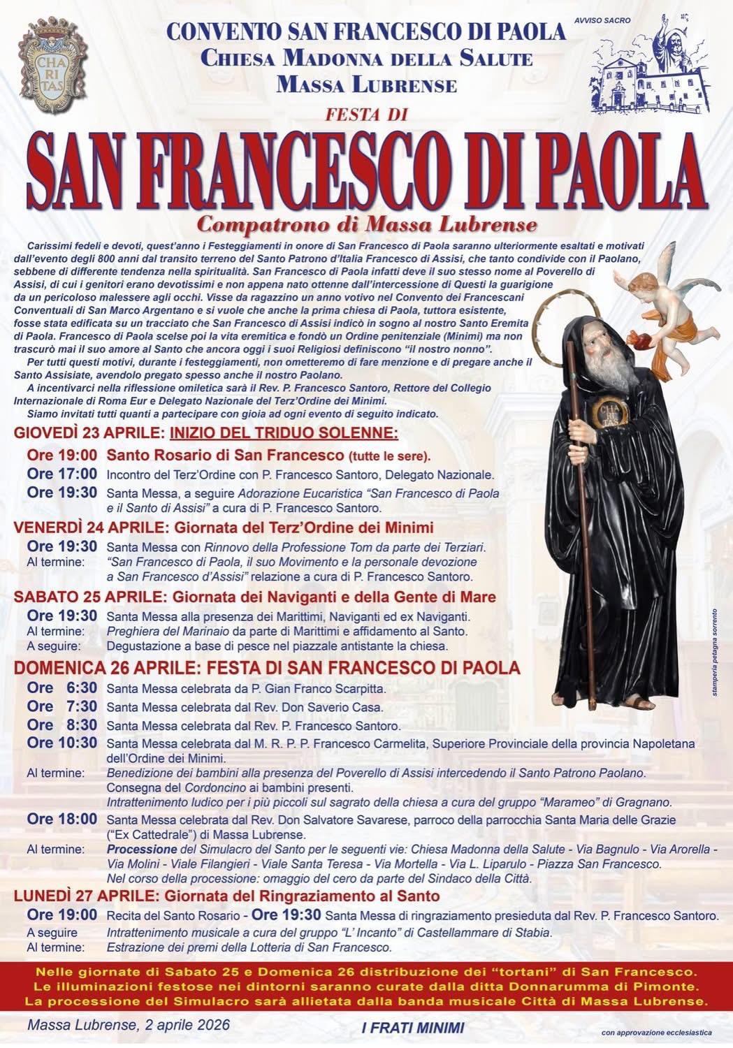 La comunità di Massa Lubrense vive uno degli appuntamenti religiosi più sentiti dell’anno con i solenni festeggiamenti in onore di San Francesco di Paola, compatrono della città. Dal 23 al 27 aprile 2026, presso il Convento San Francesco di Paola e la Chiesa Madonna della Salute, si alterneranno celebrazioni liturgiche, incontri spirituali, momenti popolari e la tradizionale processione del simulacro del Santo.
