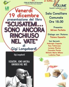 Oggi, venerdì 19 dicembre, alle ore 18.00, la Sala Consiliare Comunale di Piano di Sorrento diventerà il cuore pulsante della vita culturale cittadina con la presentazione del libro “Scusatemi… sono ancora rinchiuso nel vate” di Gigi Longobardi. L’incontro rientra nella rassegna “A tutto… Volume – Incontri letterari e non”, giunta alla sua terza edizione, confermandosi come uno spazio di confronto e condivisione dedicato alla parola scritta e alle sue molteplici forme espressive.