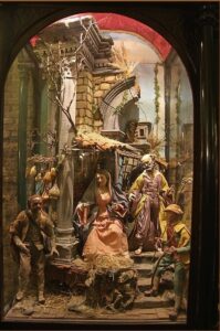 Tutto l’anno era conservato sopra un mezzanino posizionato in alto, tra la cappella e le salette interne e la presa di quello scarabattolo costituiva un passo decisivo in avanti, nell’arrivo del Natale. Non pesava tanto, ma c’era bisogno di giovani robusti e forti che sapessero maneggiare con cura e delicatezza l’ingombrante manufatto; bilanciarlo con attenzione, portarlo giù con cautela per poi poggiarlo accanto all’altare, su un tavolino posto sul lato sinistro. Don Antonino dava il via all’operazione intorno alla metà di dicembre, dopo la festa dell’Immacolata, in tempo per dare inizio alla Novena di Natale che inizia il 16 dicembre.