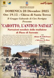Piano di Sorrento. Oggi, domenica 28 dicembre, alle ore 19.15, la Chiesa di Santa Teresa ospiterà “Carotto, l’antico Natale”, serata di narrazioni natalizie dedicate alla tradizione di Piano di Sorrento promossa dall’Assessorato alla Cultura in collaborazione con il Gruppo Culturale di Ciro Ferrigno.