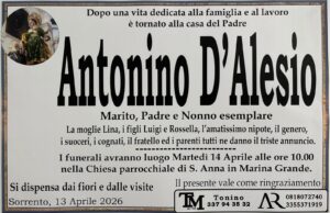 Sorrento. Dopo una vita dedicata alla famiglia ed al lavoro si è concluso il cammino terreno di Antonino D’Alesio. Marito, padre e nonno esemplare lascia nel dolore la moglie Lina, i figli Luigi e Rossella, l’amatissimo nipote, il genero, i suoceri, i cognati, il fratello ed i parenti tutti che ora l’accompagnano con la preghiera nel suo ultimo viaggio verso la dimora eterna.