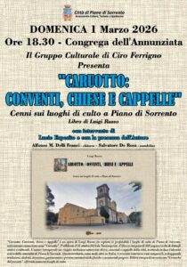 Piano di Sorrento. Alle ore 18.30 di oggi, domenica 1° marzo, la suggestiva cornice della Congrega dell’Annunziata ospiterà un appuntamento culturale di grande interesse per la comunità locale. Il Gruppo Culturale di Ciro Ferrigno presenta il volume di Luigi Russo dal titolo “Caruotto: Conventi, chiese e cappelle. Cenni sui luoghi di culto a Piano di Sorrento”, un’opera dedicata alla riscoperta dell’identità religiosa e storica della città.
