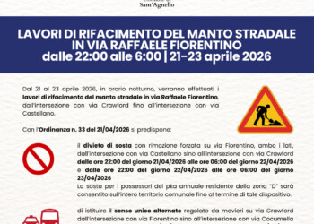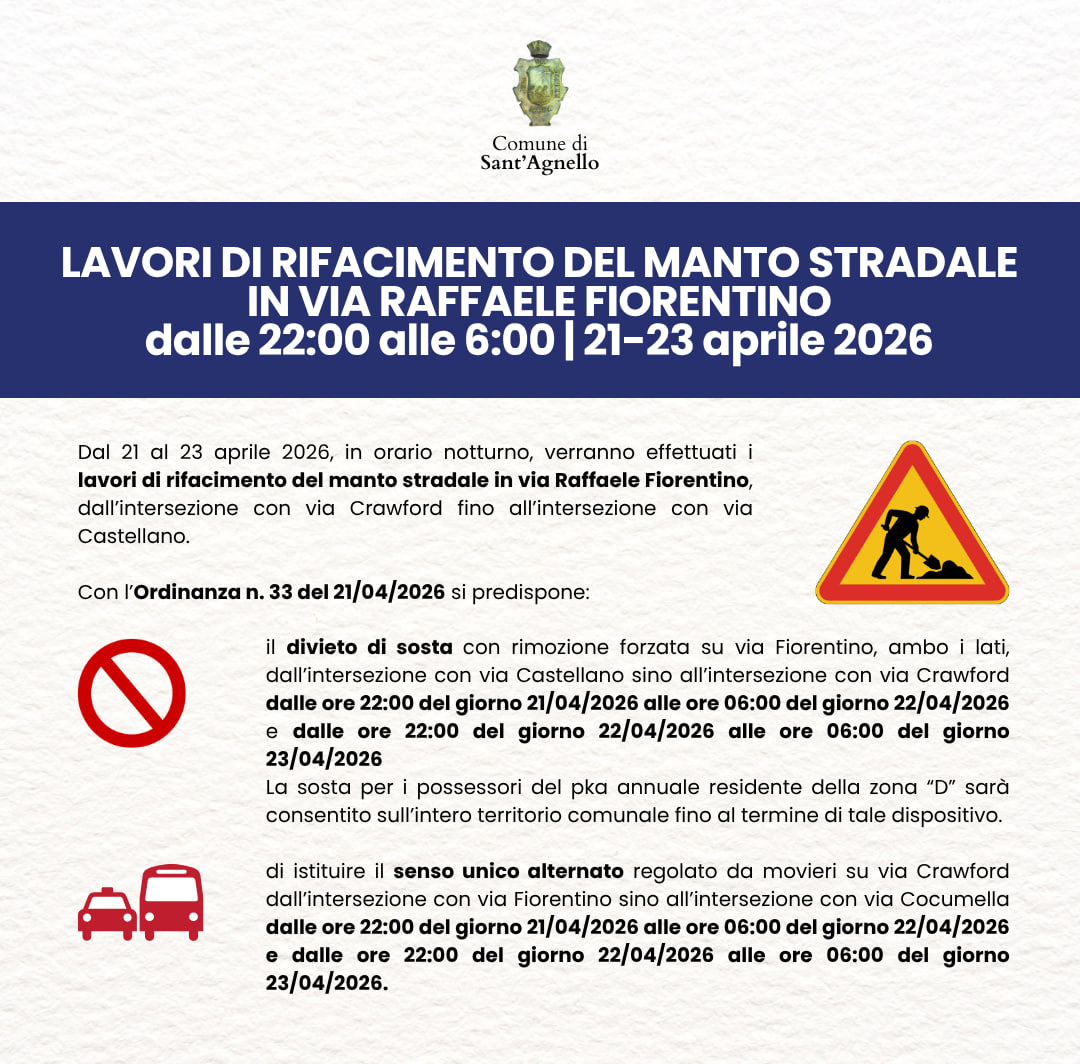 Sul territorio comunale del Comune di Sant’Agnello, dal 21 al 23 aprile 2026, in orario notturno, verranno effettuati i lavori di rifacimento del manto stradale in via Raffaele Fiorentino, dall’intersezione con via Crawford fino all’intersezione con via Castellano.