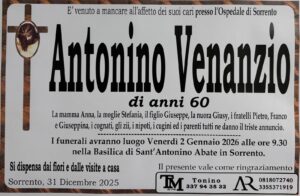 I funerali avranno luogo venerdì 2 gennaio 2026, alle ore 9.30, nella Basilica di Sant’Antonino Abate in Sorrento.