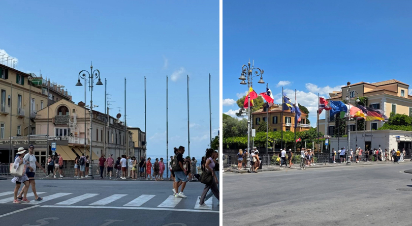 Le bandiere erano un dettaglio, eppure raccontavano una città aperta al mondo, pronta a celebrare feste, eventi, gemellaggi. Turisti e residenti alzavano lo sguardo e trovavano un arcobaleno di colori a incorniciare la piazza simbolo di Sorrento. Un colpo d’occhio semplice ma efficace, capace di trasformare l’atmosfera.
