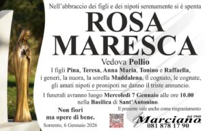 Sorrento. Nell’abbraccio dei figli e dei nipoti serenamente si è spenta Rosa Maresca (vedova Pollio). A darne il triste annuncio i figli Pina, Teresa, Anna Maria Tonino e Raffaella, i generi, la nuora la sorella Maddalena, il cognato, le cognate, gli amati nipoti e pronipoti che ora affidano la sua anima a Dio affinché l’accolga tra le sue braccia e le doni il riposo eterno.