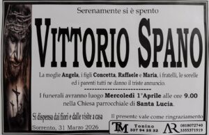 Cordoglio a Sorrento per la scomparsa di Vittorio Spano che lascia nel dolore la moglie Angela, i figli Concetta, Raffaele e Maria, i fratelli, le sorelle ed i parenti tutti che ora l’accompagnano con la preghiera nel suo ultimo viaggio verso la dimora eterna.