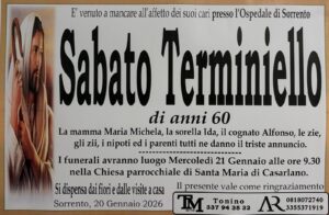 Sorrento. All’età di 60 anni, presso l’Ospedale di Sorrento, è venuto a mancare all’affetto dei suoi cari Sabato Terminiello. A darne il triste annuncio la mamma Maria Michela, la sorella Ida, il cognato Alfonso, le zie, gli zii, i nipoti ed i parenti tutti che ora l’accompagnano con la preghiera nel suo ultimo viaggio verso la dimora eterna.