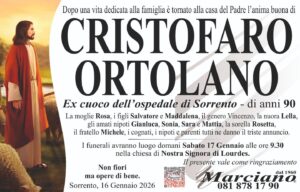 Sorrento. All’età di 90 anni, dopo una vita dedicata alla famiglia, si è concluso il cammino terreno di Cristofaro Ortolano (ex cuoco dell’ospedale di Sorrento). A darne il triste annuncio la moglie Rosa, i figli Salvatore e Maddalena, il genero Vincenzo, la nuora Lella, gli amati nipoti Gianluca, Sonia, Sara e Mattia, la sorella Rosetta, il fratello Michele, i cognati, i nipoti ed i parenti tutti che ora l’accompagnano con la preghiera nel suo ultimo viaggio verso la dimora eterna.
