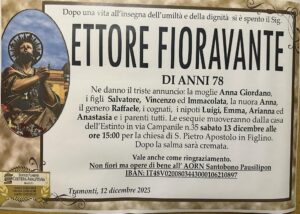 Tramonti. All’età di 78 anni, dopo una vita all’insegna dell’umiltà e della dignità, si è concluso il cammino terreno di Ettore Fioravante che lascia nel dolore la moglie Anna Giordano, i figli Salvatore, Vincenzo ed Immacolata, la nuora Anna, il genero Raffaele, i cognati, i nipoti Luigi, Emma, Arianna ed Anastasia ed i parenti tutti che ora l’accompagnano con la preghiera nel suo ultimo viaggio verso la dimora eterna.
